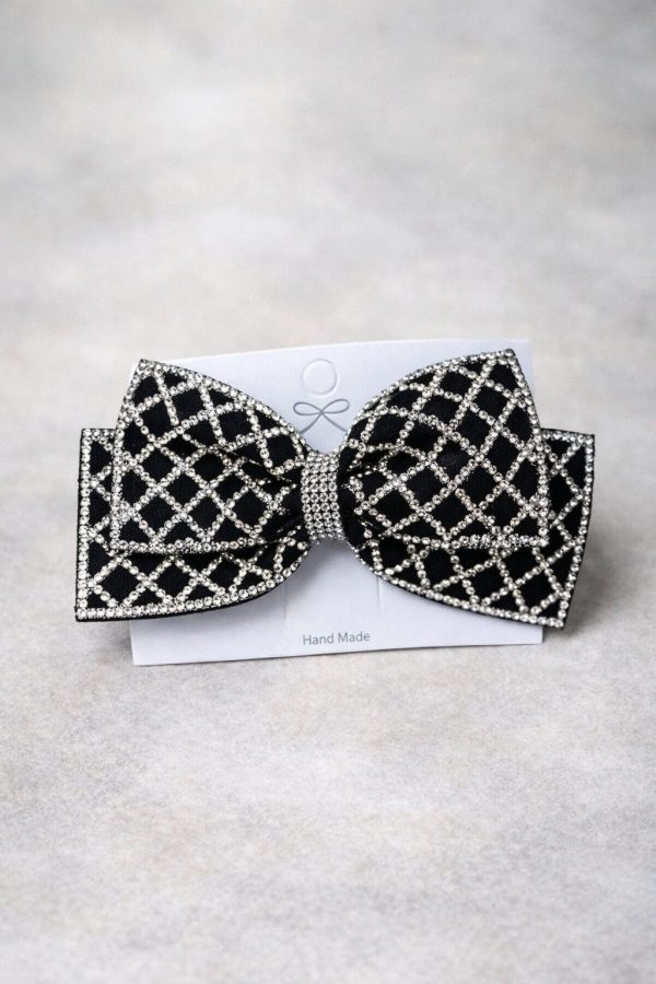 Enhance your hairstyle with this elegant Black Diamond Bow Hair Clip, designed to bring a touch of luxury and sparkle to any look. Crafted with premium black fabric and embellished with shimmering diamond-style stones in a beautiful lattice pattern, this bow hair accessory offers a perfect balance of glamour and sophistication.