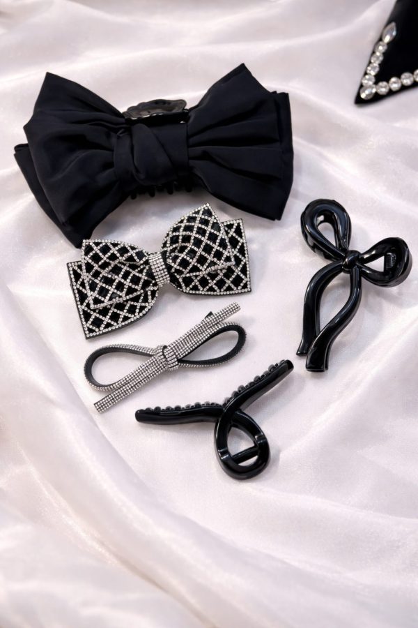 Elevate your hairstyle with our Midnight Luxe Hair Accessories Set, a thoughtfully curated collection designed for timeless elegance. This premium black set includes a statement satin bow claw, crystal-embellished bow clips, sleek glossy claw clips, and minimalist bow designs that blend sophistication with versatility.