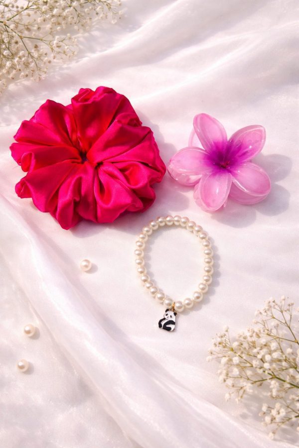 Elevate your hair styling with this beautifully curated Blush Bloom Hair Accessories Trio, designed for elegance and versatility. The set includes a luxuriously soft satin scrunchie that provides a strong yet gentle hold without tugging, a translucent flower hair clip that adds a playful floral charm, and a delicate pearl bracelet finished with a cute panda charm for a graceful accent.
