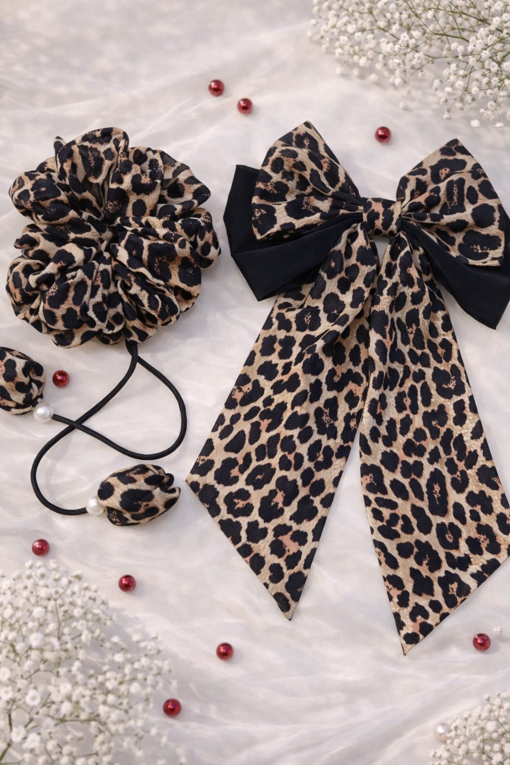 Elevate your hair game with this Premium Organza Leopard Print Bow & Scrunchie Set, crafted for women who love bold yet elegant accessories. Made from lightweight, glossy organza fabric, this set features a beautifully structured oversized bow paired with a soft, stretchable scrunchie for comfortable all-day wear.