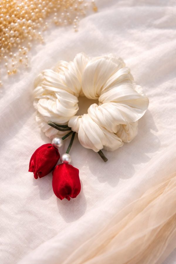 Add a touch of elegance to your hair with this Medium Fluffy Premium Organza Scrunchie, crafted in soft ivory organza for a rich, voluminous look. Finished with beautiful red satin rose charms and pearl detailing, this scrunchie blends softness with statement style.