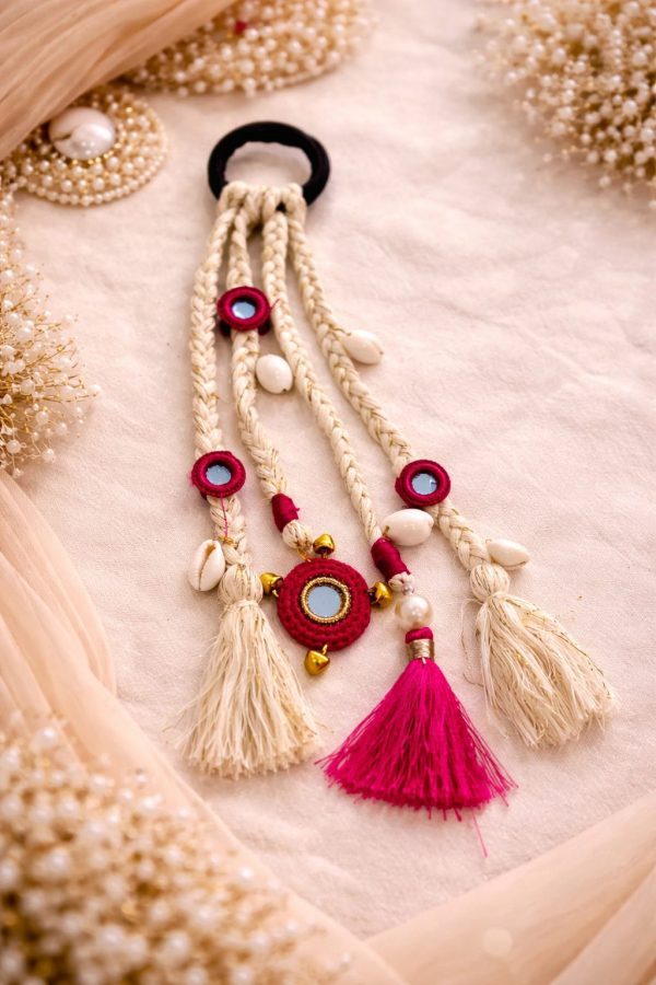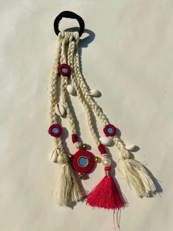 Add a touch of soft elegance to your hairstyle with this White and Pink Hair String, beautifully handcrafted with ivory-toned braids, delicate mirror accents, pearl beads, and natural shell detailing. Finished with a vibrant pink tassel, this piece blends traditional charm with modern boho aesthetics.