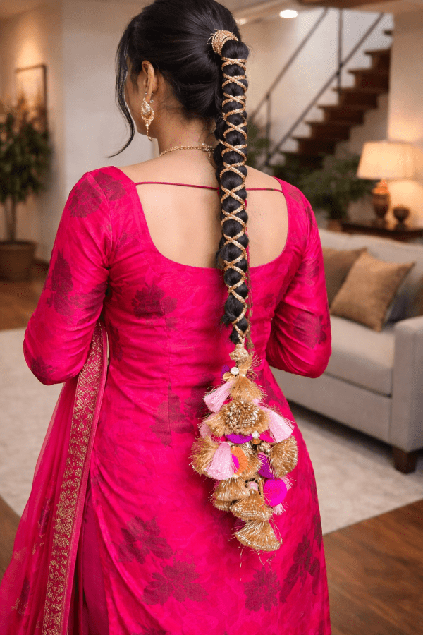 Whether paired with a vibrant Punjabi salwar suit, phulkari dupatta, or ethnic attire, the Pink Tulip Golden Paranda completes your look with timeless charm and feminine elegance.