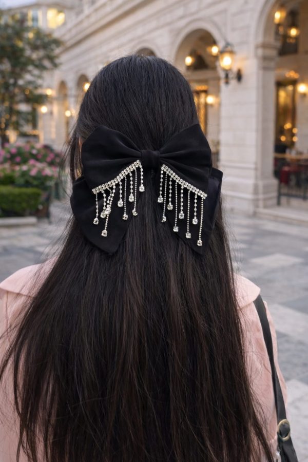 Add timeless elegance to your hair accessories collection with the Midnight Glam Rhinestone Organza Bow – Black. Crafted from premium-quality organza fabric, this bow features a soft yet structured silhouette that drapes beautifully over the hair. The highlight is its delicate rhinestone fringe detailing, designed to shimmer with every movement and add a luxurious statement touch.