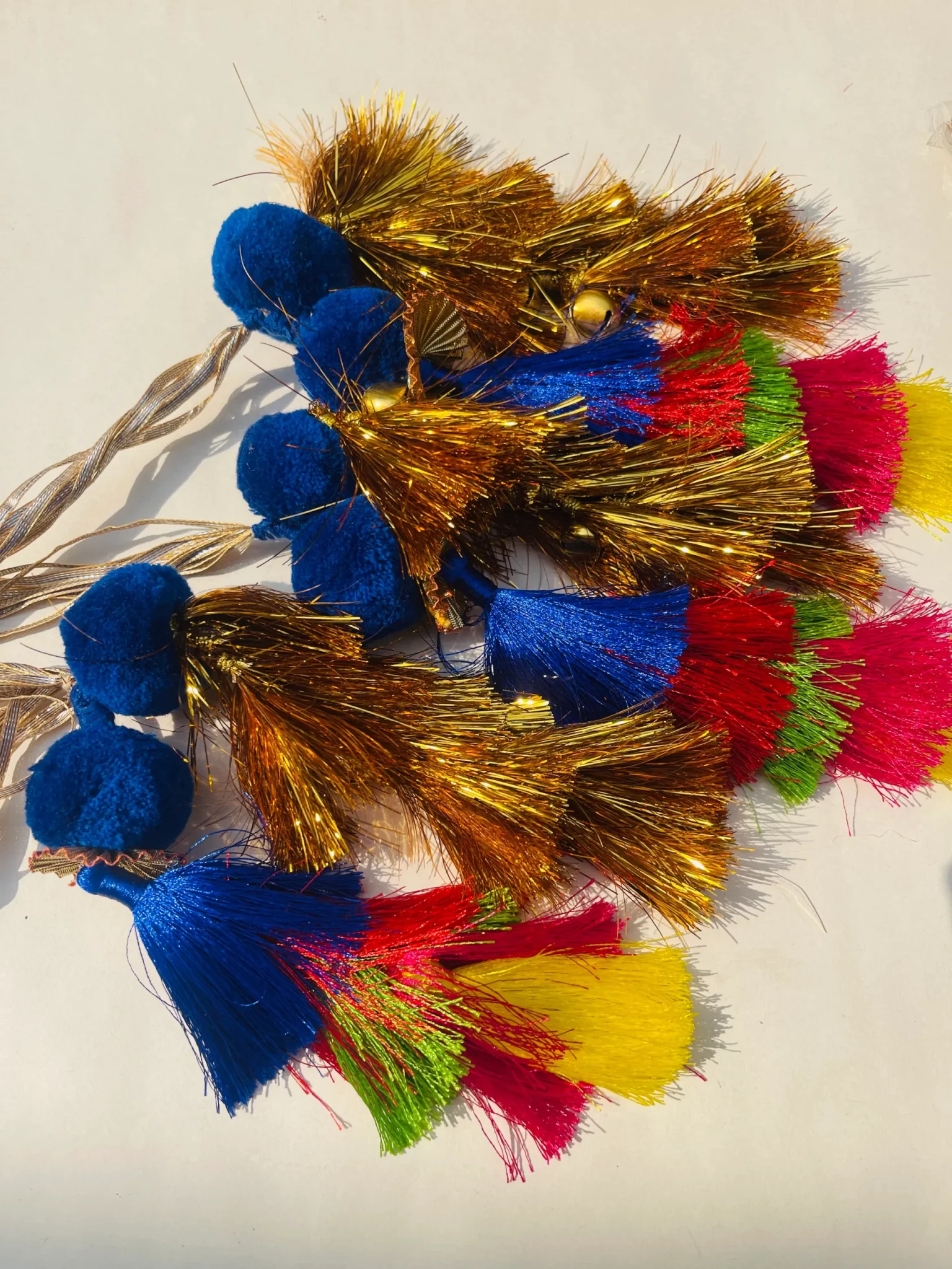 Add a burst of colour to your traditional look with our Multicolour Paraandi – Multi. Crafted with rich golden zari tassels, soft pom-poms, and bright multicolour thread detailing, this parandi brings a joyful Punjabi folk vibe to any hairstyle.