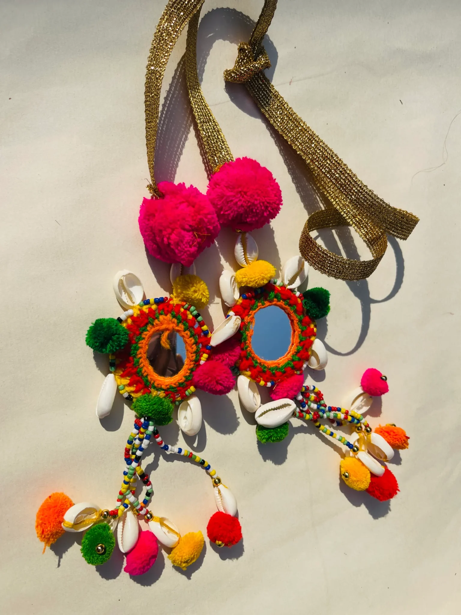 Add a splash of colour and tradition to your look with this Multicolour Paraandi, beautifully handcrafted with mirror accents, cowrie shells, beads, and playful pom-poms. Designed to stand out, this paraandi blends folk charm with modern boho vibes.
