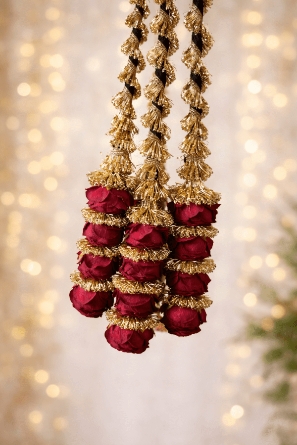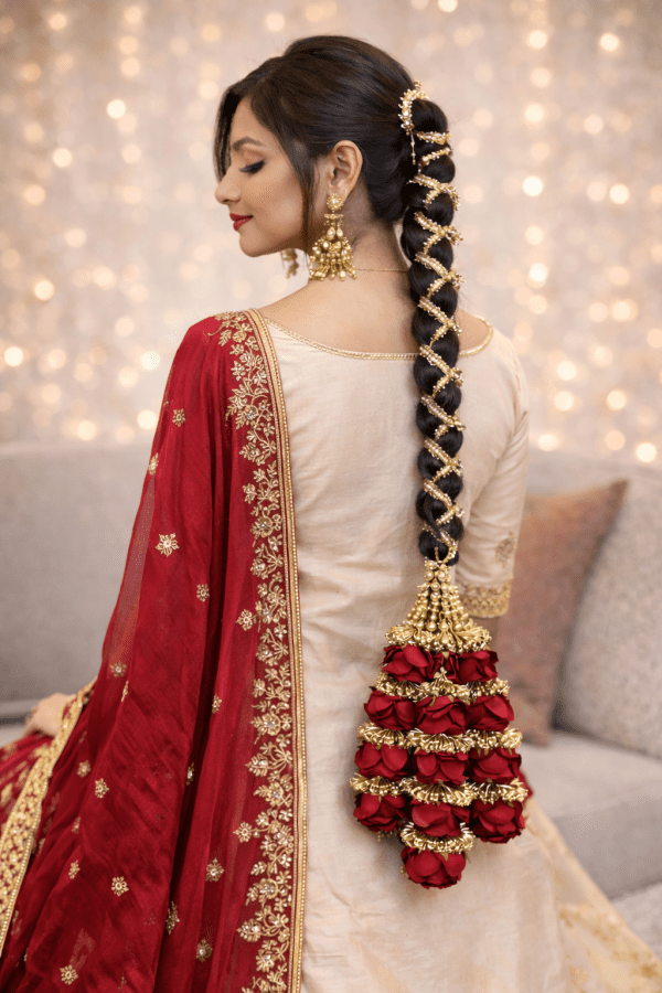 Whether styled with a Punjabi salwar suit, lehenga, or festive ethnic attire, the Red Rose Golden Paranda brings timeless charm and grandeur to your traditional look.