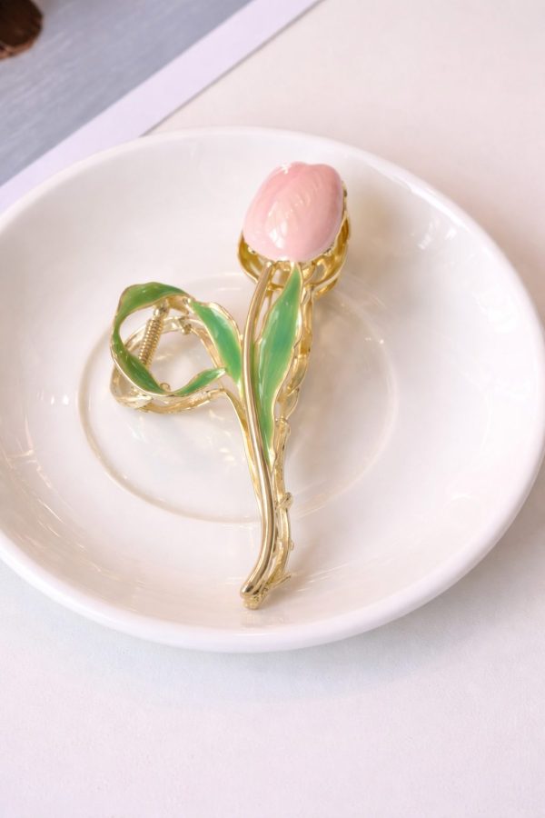 Add a touch of refined elegance to your hairstyle with our Blush Tulip Bloom Metal Hair Claw. Inspired by the delicate beauty of tulip flowers, this design features a soft pastel tulip bud, gold-tone metal stem, and glossy green enamel leaves for a graceful, nature-inspired finish.